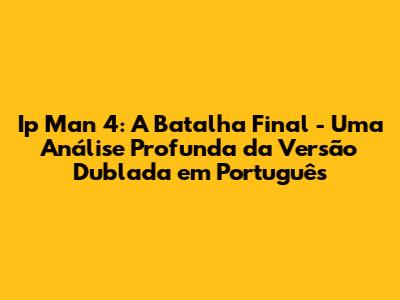 Ip Man 4: A Batalha Final, o emocionante desfecho da saga do lendário mestre de Wing Chun, chegou aos cinemas e, para a alegria dos fãs brasileiros, a versão dublada em português está disponível. Neste artigo, vamos mergulhar nos detalhes desse filme épico, explorando a trama, os personagens, a ação de tirar o fôlego e, claro, a qualidade da dublagem em português. Se você é fã de artes marciais, ação e da história inspiradora de Ip Man, prepare-se para uma análise completa!